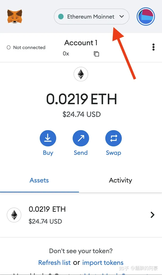 网络选择器按钮(当前网络旁边的向下箭头)。这将显示您已连接的网络列表