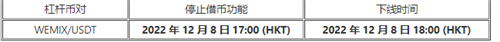 为了营造区块链行业健康的数字资产环境,优化项目的流动性,给用户提供良好的交易体验,抹茶风控部门根据《抹茶关于隐藏TOKEN及下线交易对的规则》,对平台已上线项目进行了全面的市场监测和进展跟踪,并且结合广大用户对项目的投诉及反馈意见,将对 WEMIX Tmxcen (WEMIX) 进行下线处理,具体计划如下:一、币币交易抹茶计划于 2022 年 12 月 8 日 21:00 (HKT) 暂停币币交易服务,撤销市场所有订单。二、杠杆交易及活期借贷