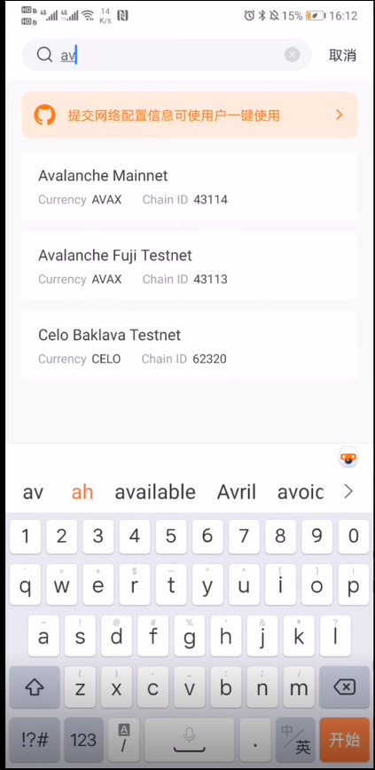 4.点击上方的搜索栏,搜索avalanche的网络。选择第一个Avalanche Mainnet(即雪崩主网络)