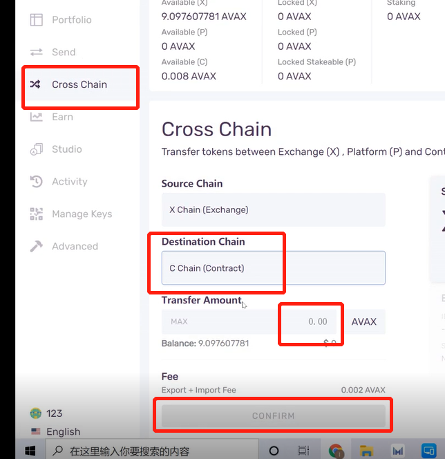 1、成功导入钱包后,我们在Avalanche网页钱包上进行跨链操作(即把X链上的币转到C链上)2、点击Avalanche钱包左侧的Cross Chain——目的链选择C链——填入要转入的金额,点击CONFIRM即可完成