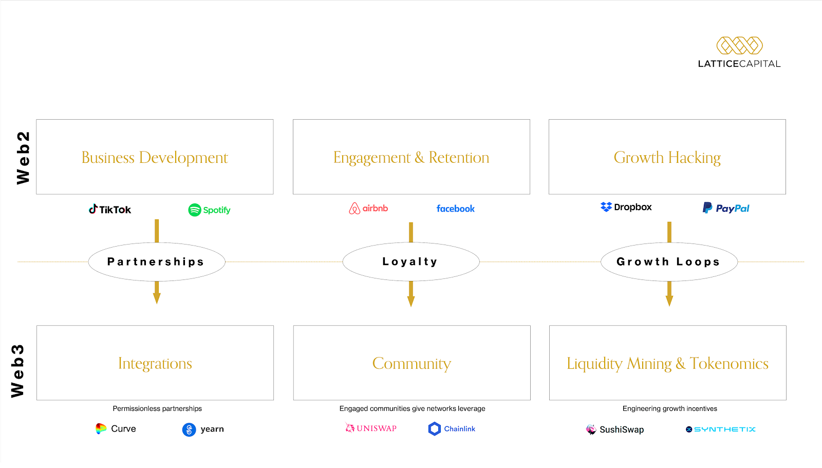 Web3 的营销增长法则Lattice Capital 对 Web3 项目制定的增长手册中提出:合作伙伴关系、用户所有权和代币驱动的增长池是 Web3 增长战略的支柱。