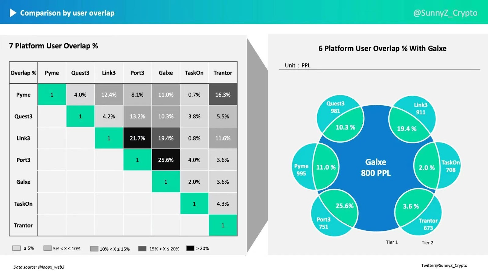 如果需要品牌效应和用户流量的项目,可以选择 Galxe 和 Quest3,比较知名且用户量高; 如果需要更多链选择的项目,可以选择 Galxe 和 TaskOn,这两个接链较多的平台; 如果追求用户真实性,那么拥有 92.9% 真实用户量的 TaskOn 将会是各项目的首选平台;当然,如果想综合使用,那么用户的重复率也将是一个必须考察的指标。根据@SunnyZ_Crypto 的统计,我们可以得到如下图表: