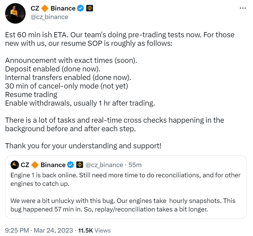 3月24日消息,币安创始人CZ发推称:“预计 60 分钟预计到达时间。我们的团队现在正在进行交易前测试。我们的 SOP(标准操作程序)大致如下:确切时间的公告(很快);启用存款(现在完成);启用内部传输(现在完成);30 分钟取消模式(尚未) 恢复交易;启用提款,通常在交易后 1 小时。在每个步骤之前和之后,后台都会发生许多任务和实时交叉检查。”