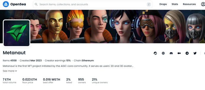 Metanaut 是 AIGC 发的 NFT 项目。措辞很有意思:Metanaut 是 AIGC 核心社区发起的第一个 NFT 项目。