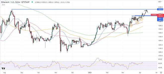 此外,宏观有利因素,例如美联储将在今年晚些时候降息以避免银行危机和衰退的预期,继续为加密货币市场提供广泛支持。虽然可以肯定地说 ETH 具有积极的中长期前景,但押注该加密货币今年将重返历史高位是另一回事。以太币今年创下历史新高将需要它从当前水平上涨 160%。但这是加密货币市场。ETH 已经从去年 800 美元的低点上涨了 100% 以上。在 2020 年 11 月到 2021 年 4 月之间,以太币上涨了 600%。因此,不应排除今年 160% 的反弹可能性。