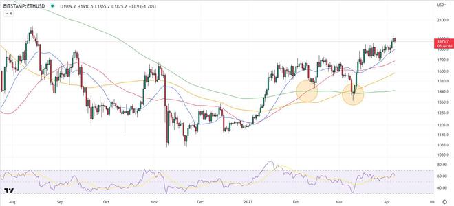 价格预测 – ETH 能否在 2023 年创下历史新高?即使 ETH 经历 Shapella 升级后的下跌,许多人预计下跌也将是短暂的。ETH 也从上个月的 200 日均线强劲反弹,这是一个强劲的中期看涨指标。2 月初的“黄金交叉”(当 50 天移动平均线超过 200 天移动平均线时)是 ETH 中期技术前景的另一个好兆头。