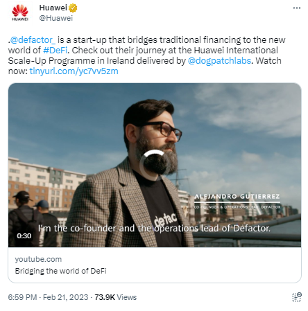 2月23日消息,华为于2月21日官方推特上发布Defactor宣传短片,并写道:“Defactor是一家连接传统融资和DeFi新世界的初创企业。看看他们在爱尔兰的华为国际提升计划的旅程。”据悉,Defactor平台旨在使传统企业能够获得DeFi流动性,为现实世界的资产融资。Defactor专注于使用区块链技术来改善当前的保理,贸易融资和库存融资系统。