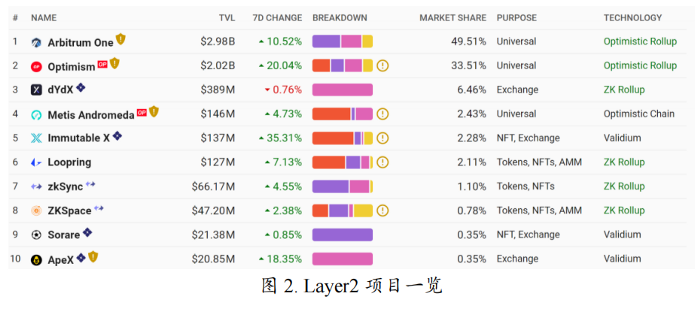 目前,Arbitrum是以太坊二层扩容方案中TVL最大的项目,达到2.98B,占所有网络的3.01% TVL份额,在L2中还拥有49.51%的TVL份额。Arbitrum Rollup是一种由链上以太坊合约管理的链下协议,所以准确地说Arbitrum并不是一条区块链,而是把链下交易通过压缩算法上传到以太坊主网。这种方式能够部分解决以太坊面临的拥堵问题,以达到快速交易、低gas fee、安全性保证、用户体验好等优势。