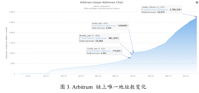 根据浏览器上的数据显示,自 6 月 21 日奥德赛活动开始到第一周任务结束时,Arbitrum 的新增地址达 20.7 w 个。并在 6 月 27 日单日新增达到了 5.5 万个,成为单日新增地址最多的一天。可见奥德赛活动之成功。