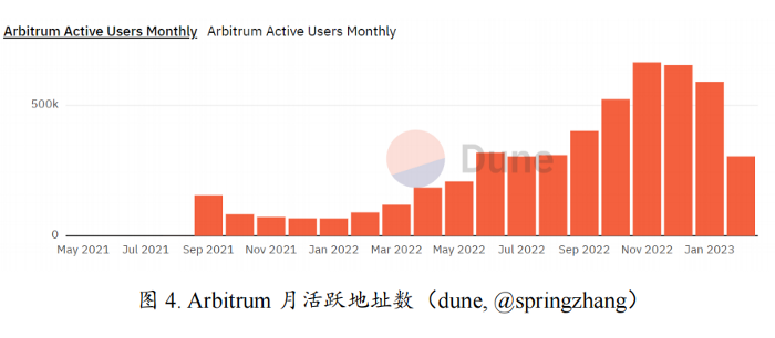 奥德赛活动之后,Arbitrum在技术上持续发力,在生态上不断推出创新机制的项目,使得其在1月底的小牛市期待值拉满。目前,Arbitrum 2022年10月-2023月1月的平均月活跃地址数为608.365k,较9月上涨了51.2%。Arbitrum的交易量与用户数也有相应的上升。