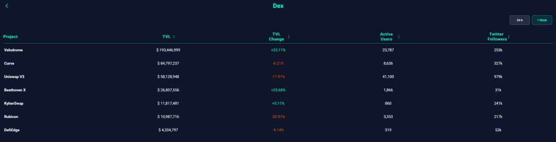 根据 Chaineye 显示,OP 上最大的 DEX 是 Velodrome,TVL 在所有 DEX 项目中遥遥领先,甚至超越第二名 Curve 一个数量级。