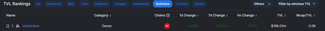 自去年 8 月 Velodrome 推出 op tmxcen 激励措施,TVL 随之暴涨,超越 Uniswap 和 Curve,并在之后的日子里长期霸榜 OP TVL 第一。从 Defillama 的数据来看,Velodrome 目前的 TVL 约为$168 m,占 OP 全链的 21.6%,无疑是 OP 上最值得关注的项目之一。