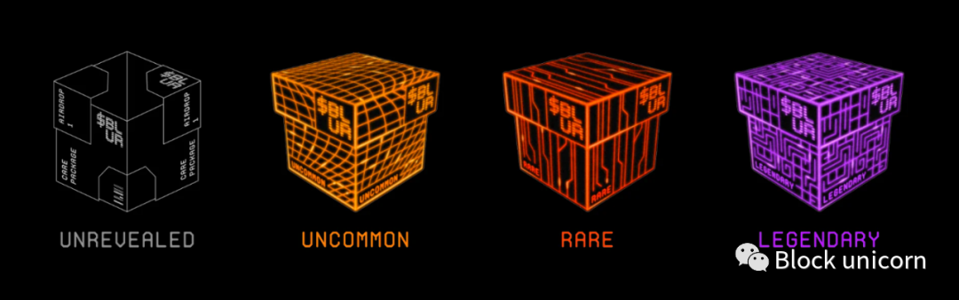 关爱包裹关爱包裹有四个不同的稀有程度:普通,稀有,传奇,神话。关怀包裹的稀有性与用户对Blur的忠诚度分数挂钩,这区分了诸如列出普通NFT或蓝筹NFT的行为,罕见的包裹将获得更多的代币。