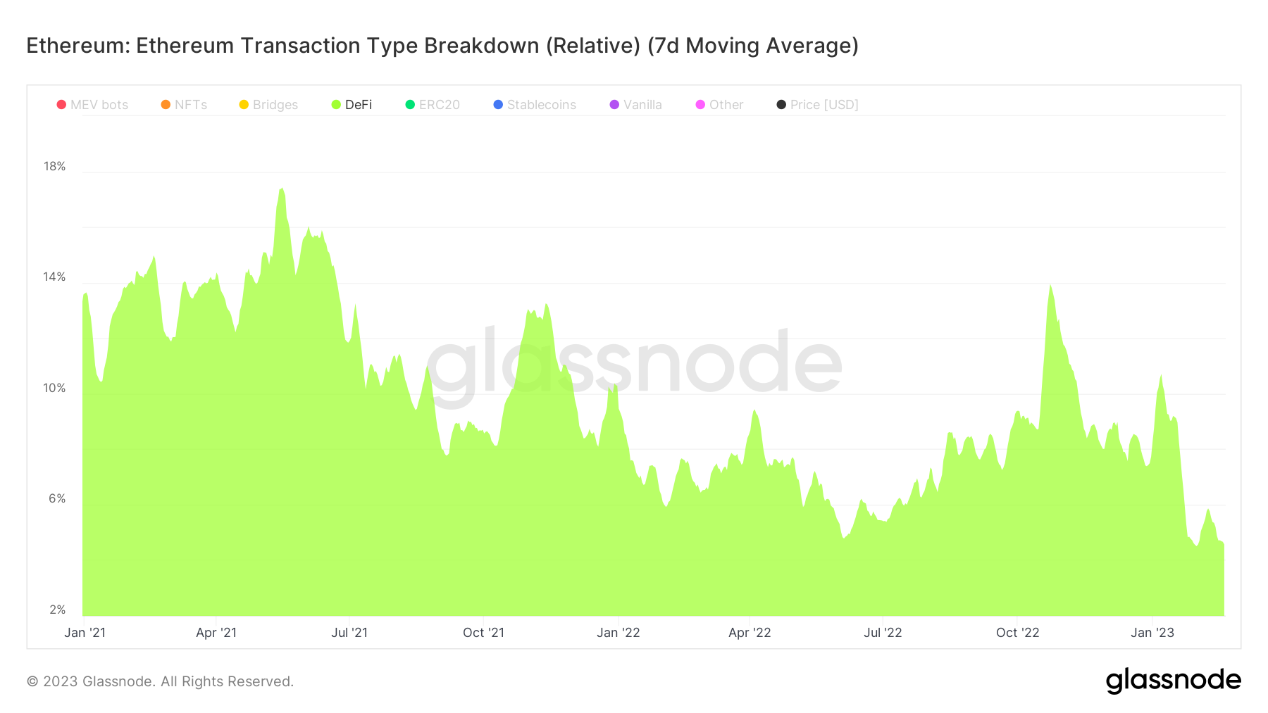 2月20日消息,今年以来,以太坊链上交易类型的格局发生了显著的变化,DeFi的交易次数即占比大幅下降,Bridges和NFT的交易次数及占比明显上升。根据glassnode的数据,从绝对变化上来看,2月18日,以太坊上DeFi类的交易次数(7天均值)约为4.12万次,为2021年以来的最低水平,较今年1月4日创下的短期高点12.44万次下降了66.84%,跌幅明显。从相对变化上看,近期DeFi类交易次数也同样处于低位。2月14日,以太坊上DeFi类的交易次数占比(7天均值)约为3.96%,为2021年以来极低水平,并且此后都维持在4.6%左右,最高不超过5.2%,与此前2年平均占比近10%的水平大相径庭。