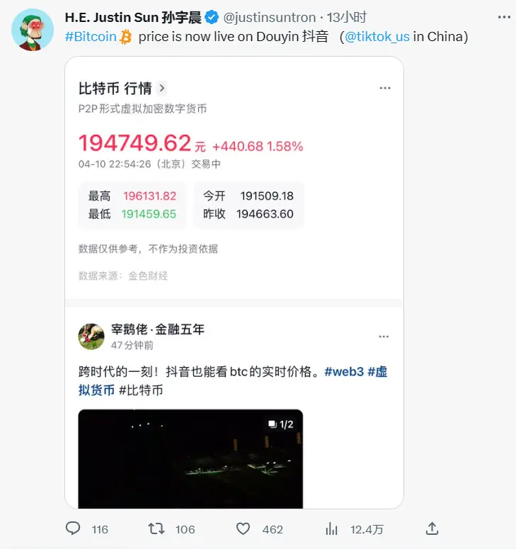 4月11日,比特币价格突破30000美元关口,虚拟货币行情又现抬头趋势,自今年以来累计上涨已超80%。就在前一晚,抖音APP内开始显示比特币价格的消息在币圈刷屏,此外,今日头条、微博搜索比特币也可以查看比特币的价格。一些虚拟货币投资者将之视为国内对待虚拟货币的态度趋于缓和的信号。然而事实上,我国对虚拟货币的监管政策一贯明确。2021年9月15日,人民银行等十部门发布《关于进一步防范和处置虚拟货币交易炒作风险的通知》,强调虚拟货币相关业务活动属于非法金融活动,并明确提到,严格禁止为虚拟货币交易提供信息中介和定价服务。抖音微博显示价格,比特币重回30000美元虚拟货币数据网站CoinMarketCap显示,比特币(BTC)价格在4月11日重回30000美元关口,截至发稿报30126美元,24小时上涨6.7%,自今年以来累计上涨超80%。昨日晚间,不久前被美国证券交易委员会(SEC)指控涉嫌非法销售证券、欺诈和操控市场的孙宇晨在其个人社交媒体账号上称,抖音开始显示比特币价格,随后这一消息在币圈刷屏。