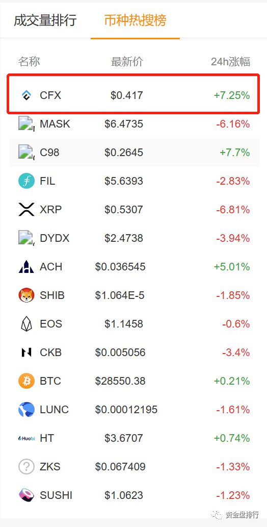 根据币安和mytmxcen的数据显示24小时热门搜索币种,把大饼和姨太排开,排在前面五个的分别第一是cfx、第二是MASK、第三是C98、第四是fil、第五是XRP。