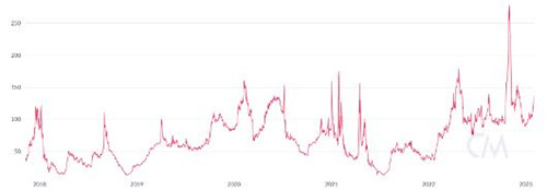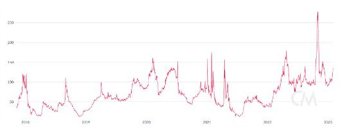 狗狗币历史 NVT 图表表明该代币可能定价过高。在过去八年中,NFT 比率在 10 到 100 之间波动,在牛市期间有一些异常值。自 2021 年年中以来,狗狗币的 NVT 指标尚未触及其长期范围的底部,这使其面临更大的下行风险。