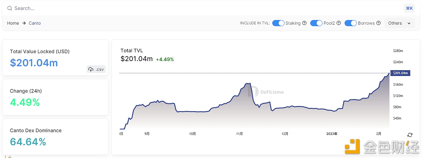 2月8日消息,据DefiLlama数据显示,Cosmos生态兼容EVM的Layer1公链Canto总锁仓量已升至2亿美元上方,创历史新高。 另据CoinGecko数据显示,当前CANTO Tmxcen在昨日创下0.764501美元ATH后小幅回落至0.717292美元,过去24小时涨幅14.9%。行情波动较大,请做好风险控制。