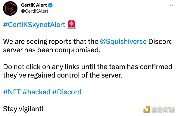消息,据CertiK监测,RektDogs项目Discord服务器遭到攻击。请社区用户在服务器修复之前不要点击任何链接。