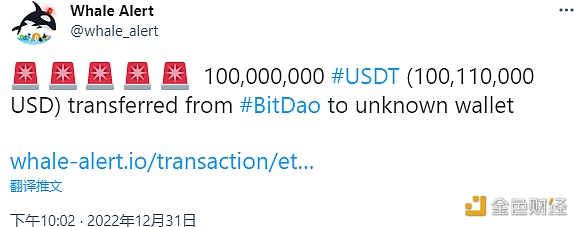 据Whale Alert监测数据显示,100,000,000枚USDT(价值约100,110,000美元)从BitDao转移到未知钱包。