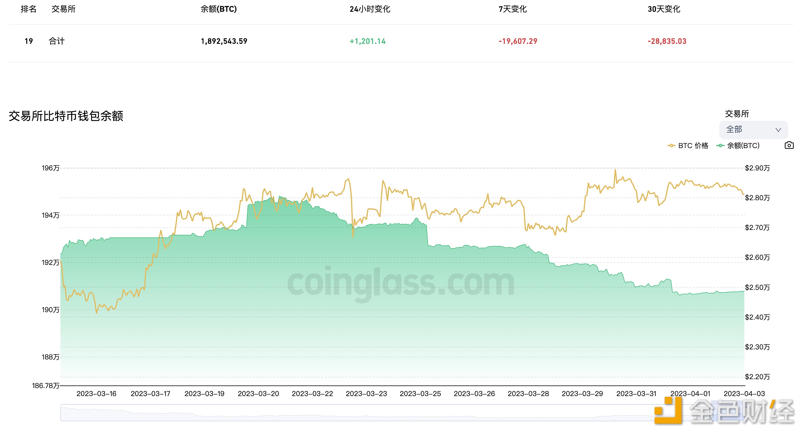 数据显示,近24小时有1,201.14枚BTC流入交易所钱包,近7天有19,607.29枚BTC流出交易所钱包,近30天有28,835.03枚BTC流出交易所钱包。截至发稿时,交易所钱包余额合计为1,892,543.59枚BTC。