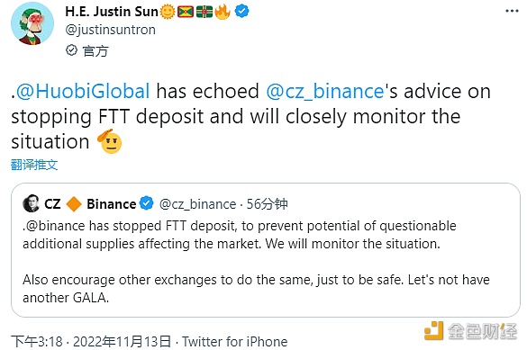 11月13日消息,孙宇晨在社交媒体发文表示,Huobi Global已经响应CZ关于暂停FTT存款的建议并将密切关注情况。 据此前报道,CZ发推称,币安已停止FTT充值,以防止可疑的额外供应可能影响市场,币安将密切关注事态发展。CZ建议其他交易所也这样做,为了安全起见,以避免出现GALA类似的情况。CZ补充说,目前FTT合约部署者转移所有剩余价值4亿美元的FTT供应量,这些FTT本应分批解锁。