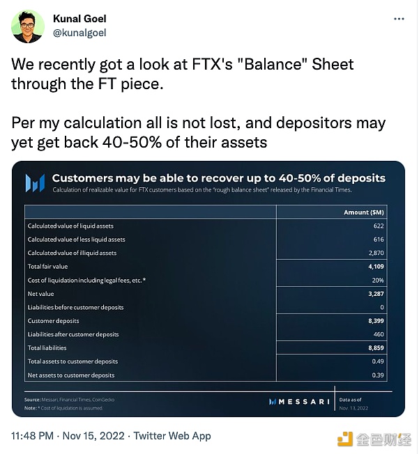 11月16日消息,数据分析机构Messari分析师Kunal Goel撰文称,在研究了FTX的“资产负债表”后,根据其计算,并不是所有的资产都消失了,存款人可能还会收回40-50%的资产。