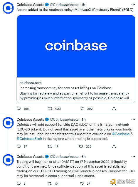 11月17日消息,据官方推特,Coinbase将在以太坊网络(ERC-20代币)上上线Lido DAO (LDO) 。如果满足流动性条件,交易将于太平洋时间11月17日9:00(北京时间11月18日0:00)或之后开始。如果建立了足够的该资产供应,LDO-USD交易对的交易将分阶段开放。 此外,Coinbase宣布将MultiversX(原Elrond)的EGLD代币添加至资产上线路线图。