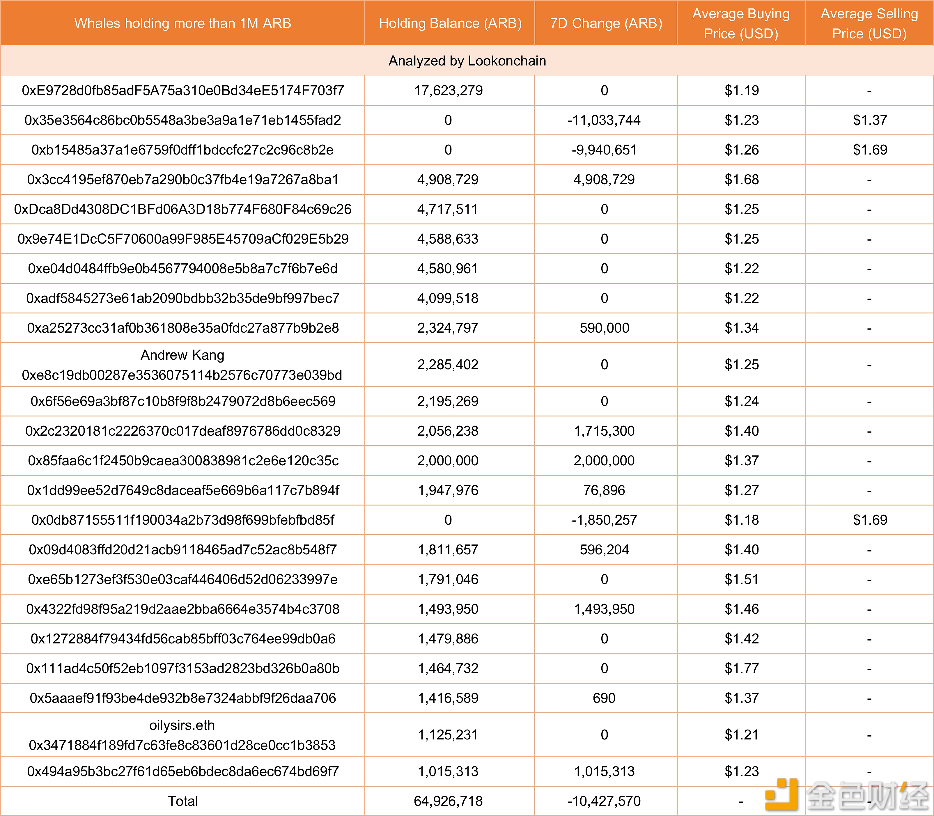 Lomxconchain监测显示,据统计,过去一周23个超过100万枚ARB的巨鲸中,3个巨鲸地址以1.37美元和1.69美元的价格售出约2280万枚ARB(约3800万美元),11个巨鲸地址既不买也不卖,9个巨鲸地址增持了1240万枚ARB(约2100万美元),大多数巨鲸购买ARB在1.2美元到1.5美元之间。