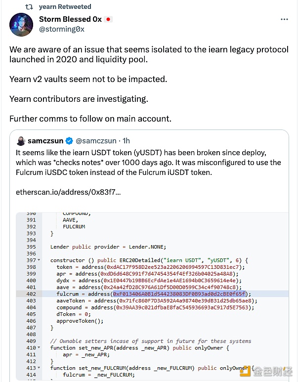 4月13日消息,针对收益聚合器 Yearn 攻击事件,Yearn 开发者 storming0x 表示,目前已知的问题与 2020 年推出的 iearn 遗留协议和流动性池无关,Yearn v2 保险库似乎没有受到影响,Yearn 贡献者正在进行调查。 此前消息,Aave 和 Yearn Finance 在今日攻击中损失金额已超 1100 万美元。