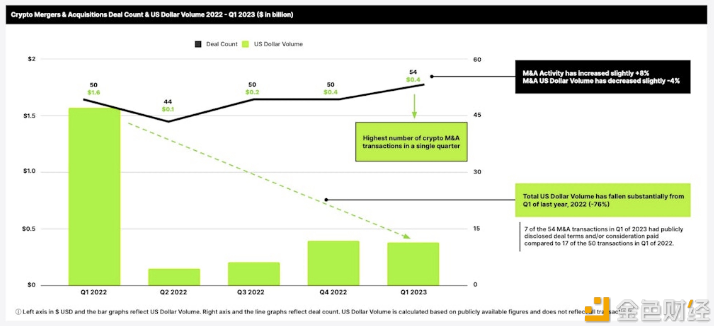 根据咨询公司Architect Partners的一份报告,2023年前三个月,加密货币公司并购的数量创下季度历史新高,因为该领域公司之间的交易有所增加。本季度的交易总数达到54笔,高于前两个季度各50笔并购交易。尽管交易数量有所增加,但交易价值(约4亿美元)与2022年第一季度相比大幅下降,当时有50笔交易,价值约16亿美元。