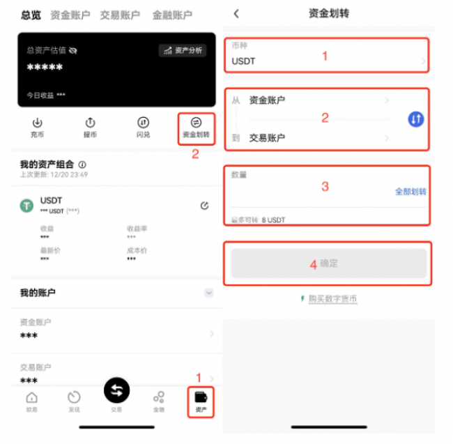 打开App,【资产】—【资金划转】—选择币种,以【USDT】为例—【资金账户】—【交易账户】—输入划转【数量】—【确定】。