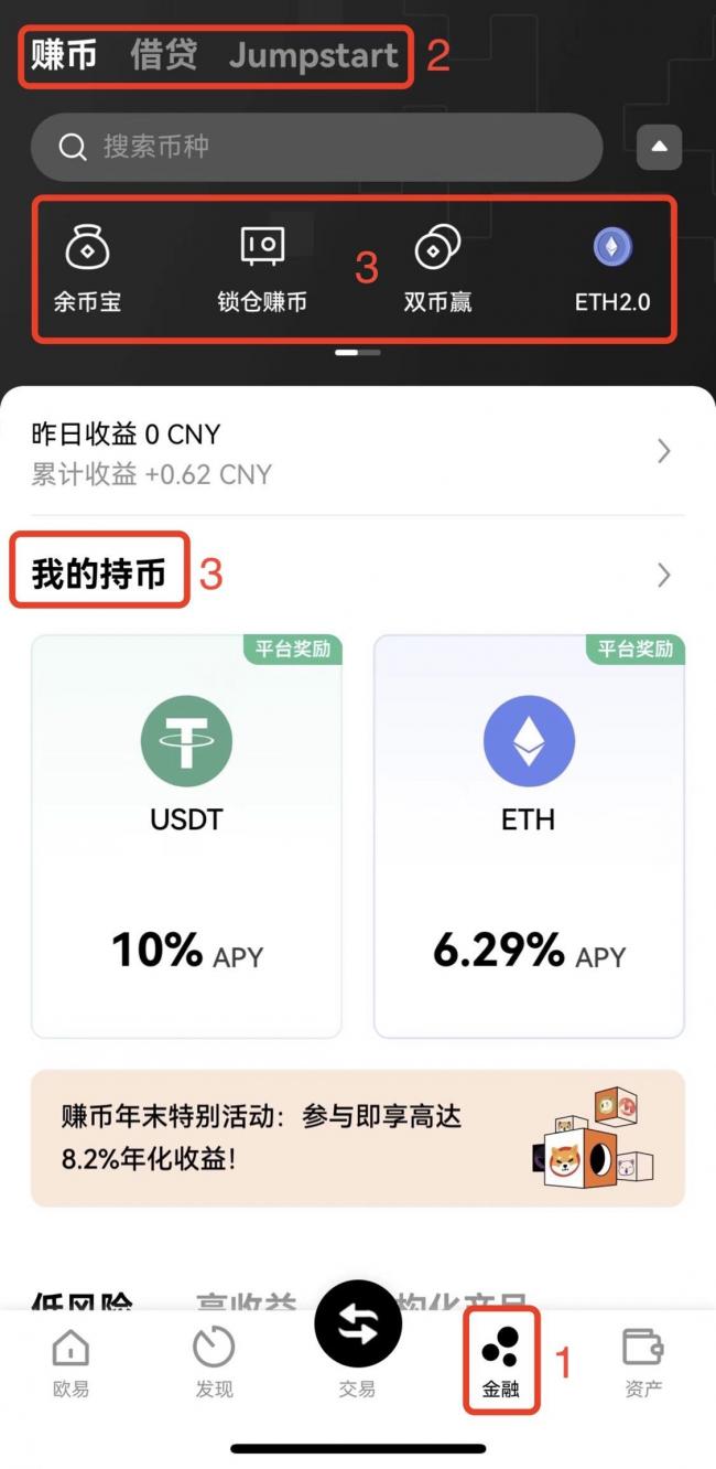 申购:打开欧易App首页,点击【金融】—【赚币/借贷/Jumpstar】— 选择您要参与的金融理财产品按要求完成申购。