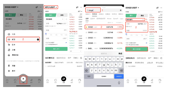 以狗狗币DOGE为例:点击【交易】栏 —【现货】; 点击左上角币对框【BTC/USDT】。