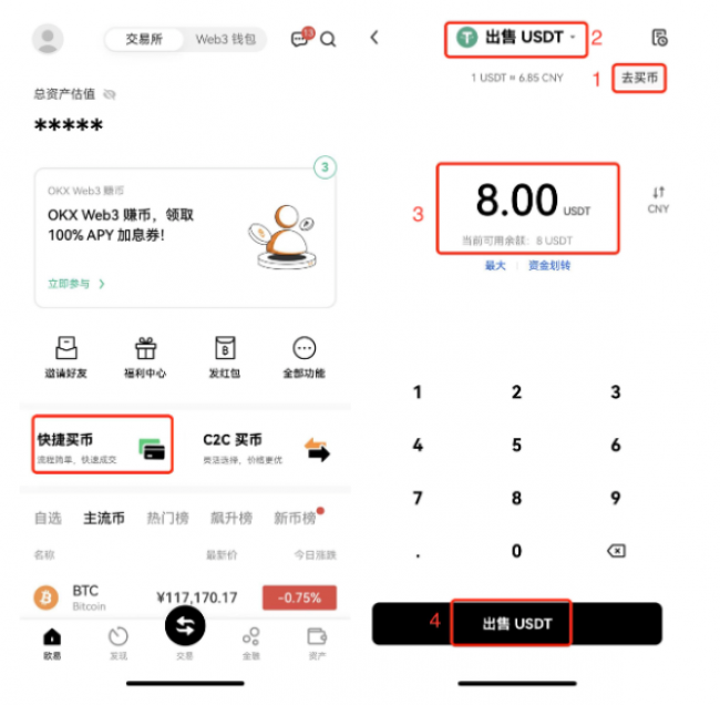 以USDT为例:打开欧易App首页,点击【买币】—【快捷买卖】—【出售】—输入【卖出数量】—【出售USDT】。