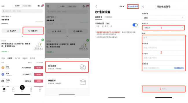 打开欧易 App首页,点击【我要买币】—【C2C买币】—右下角【我的】图标—【支付方式】—【添加收款账号】,【收款方式】选择相应的银行卡/支付宝/微信支付进行设置即可。