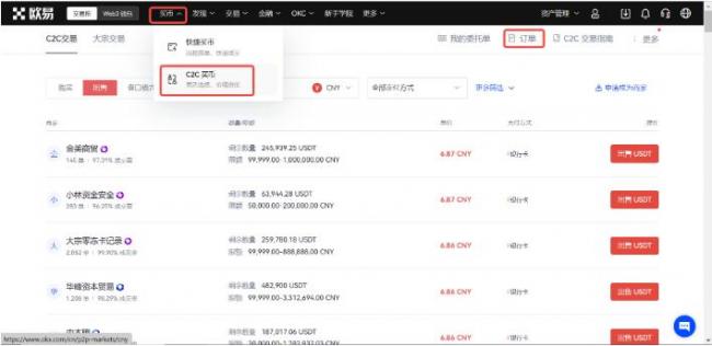 点击官网左上角【买币】【C2C买币】,点击右上角【订单】图标选择查看订单类型。