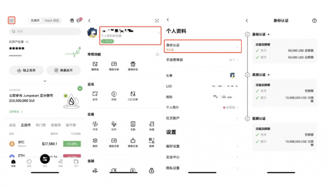 KYC认证:点击左上角个人中心图标—【个人资料和设置】—【身份认证】。